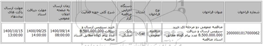 مناقصه، مناقصه عمومی دو مرحله ای خرید سرویس ارسال و دریافت 8.500.000.000 عدد پیام کوتاه مطابق اسناد مناقصه , مناقصه عمومی دو مرحله ای خرید سرویس ارسال و دریافت 8.500.000.000 عدد پیام کوتاه مطابق اسناد مناقصه