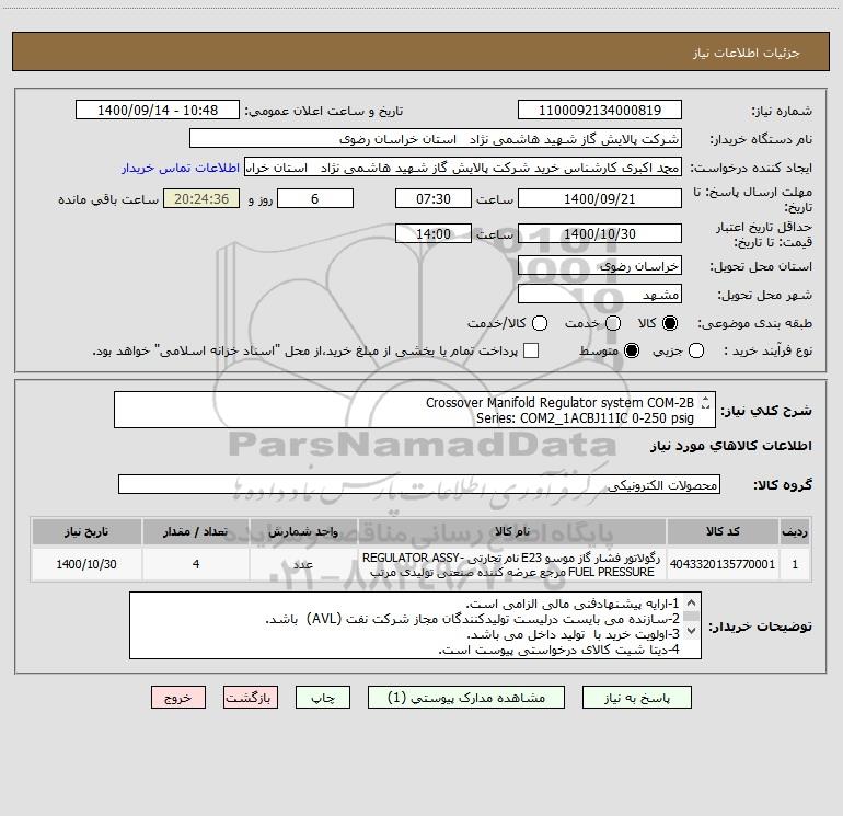 نام دستگاه خریدار:شرکت پالایش گاز شهید هاشمی نژاد استان خراسان رضوی