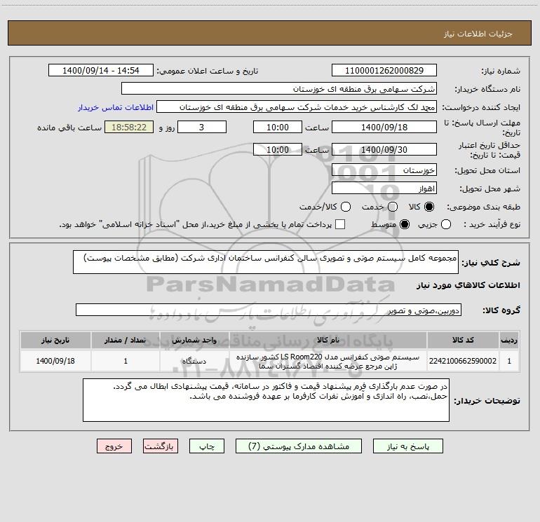 شرح کلی نیاز: مجموعه کامل سیستم صوتی و تصویری سالن کنفرانس ساختمان اداری شرکت (مطابق مشخصات پیوست)