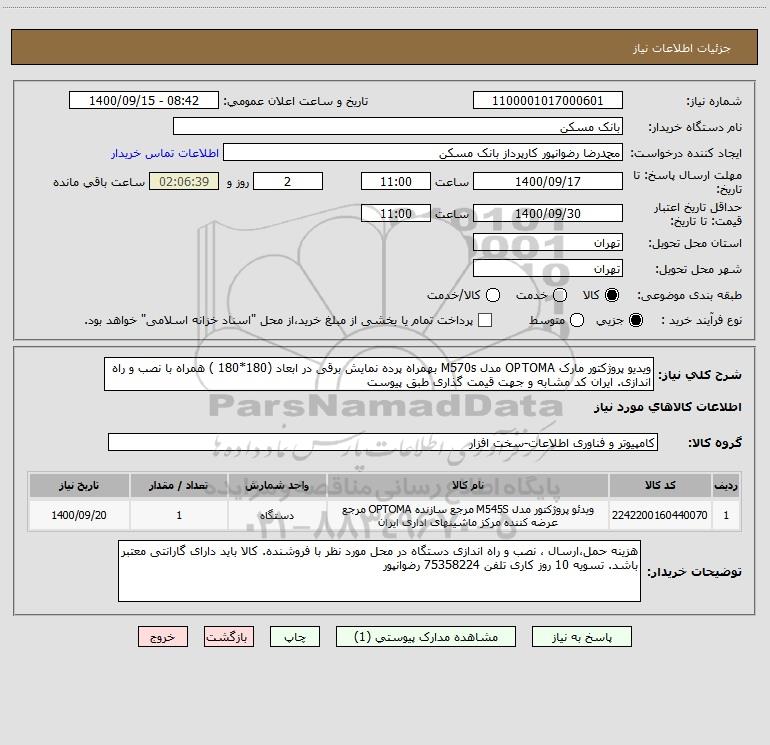 شرح کلی نیاز: ویدیو پروژکتور مارک OPTOMA مدل M570s بهمراه پرده نمایش برقی در ابعاد (180*180 ) همراه با نصب و راه اندازی. ایران کد مشابه و جهت قیمت گذاری طبق پیوست