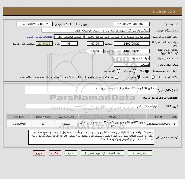 شرح کلی نیاز: پروژکتور 150 وات LED مطابق ایرانکد و فایل پیوست
