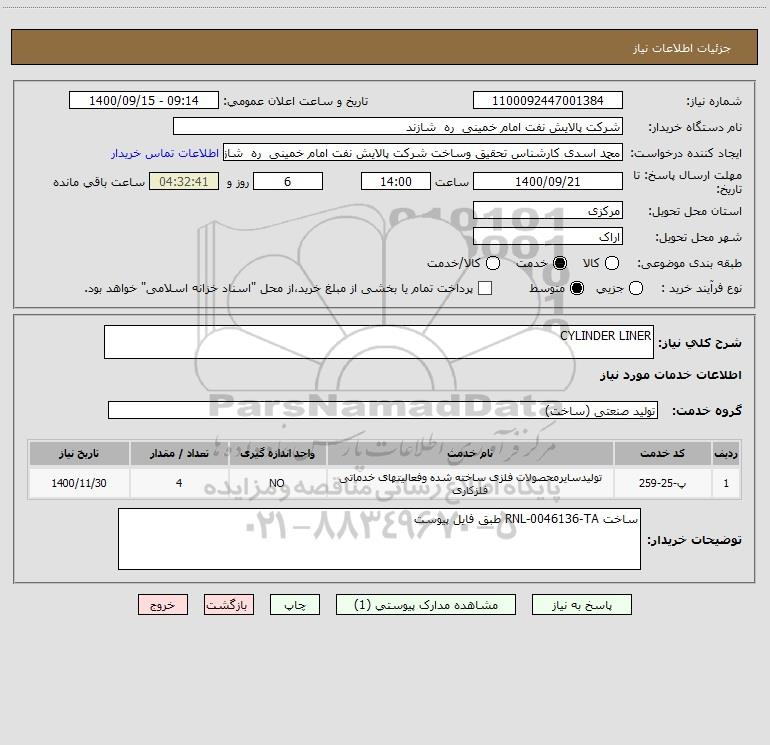 شرح کلی نیاز: CYLINDER LINER