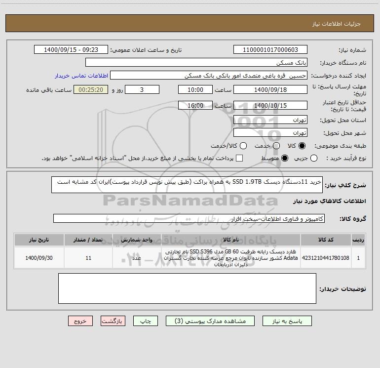 شرح کلی نیاز: خرید 11دستگاه دیسک SSD 1.9TB به همراه براکت (طبق پیش نویس قرارداد پیوست)ایران کد مشابه است