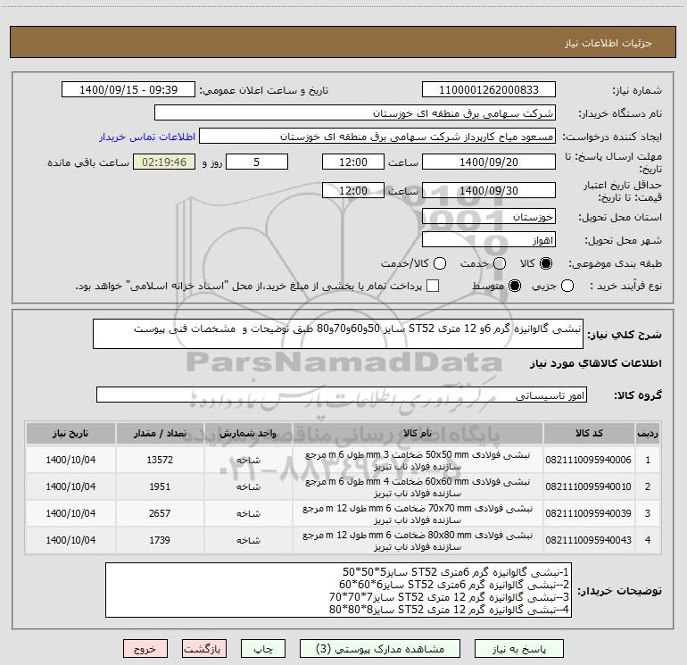 شرح کلی نیاز: نبشی گالوانیزه گرم 6و 12 متری ST52 سایز 50و60و70و80 طبق توضیحات و مشخصات فنی پیوست