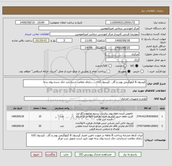 شرح کلی نیاز: کپسول 6 کیلوگرمی پودر و گاز ، کپسول co2 .....دارای علامت استاندارد حک شده روی بدنه