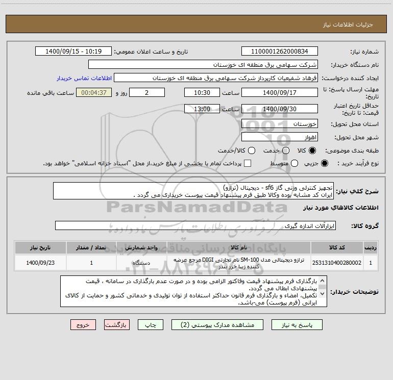 شرح کلی نیاز: تجهیز کنترلی وزنی گاز sf6 - دیجیتال (ترازو) ایران کد مشابه بوده وکالا طبق فرم پیشنهاد قیمت پیوست خریداری می گردد .