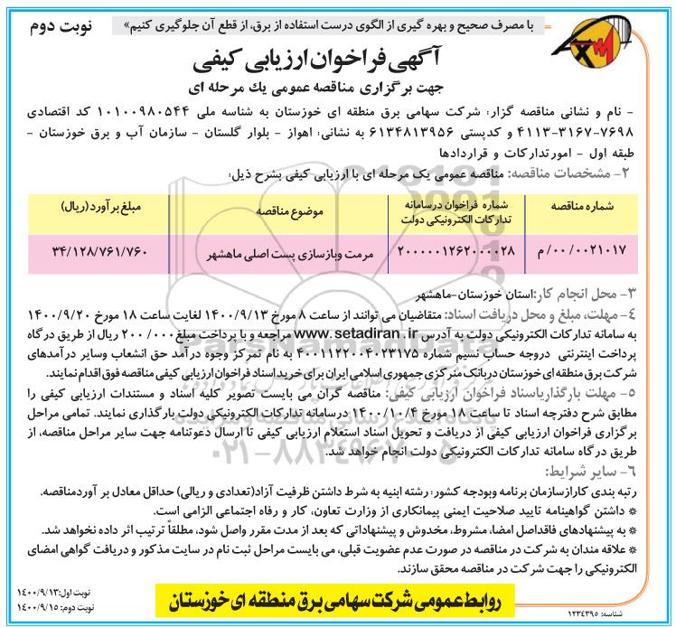 فراخوان ارزیابی کیفی مناقصه مرمت و بازسازی پست اصلی - نوبت دوم از کلیه افراد متخصص و شرکتها واجد شرایط دعوت به عمل میآید در مناقصه با کد خبرگزاری پارس نماد: 4028229 شرکت نمایند.