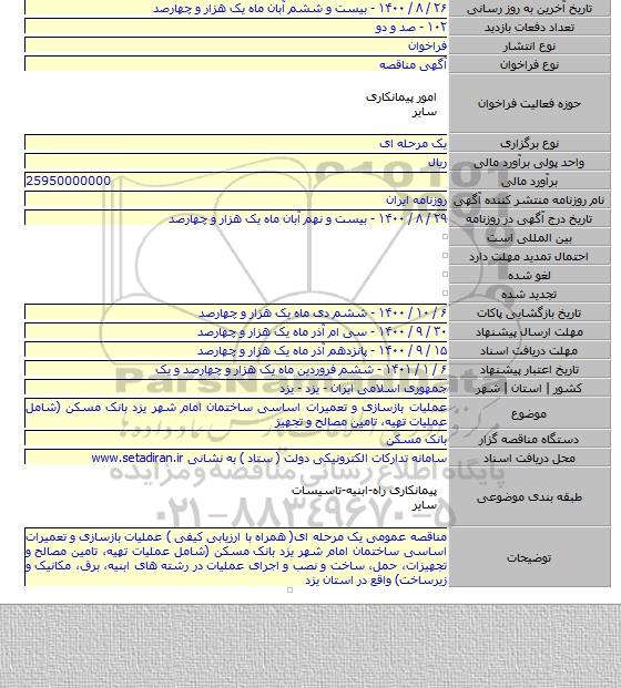 عملیات بازسازی و تعمیرات اساسی ساختمان امام شهر یزد بانک مسکن (شامل عملیات تهیه، تامین مصالح و تجهیز