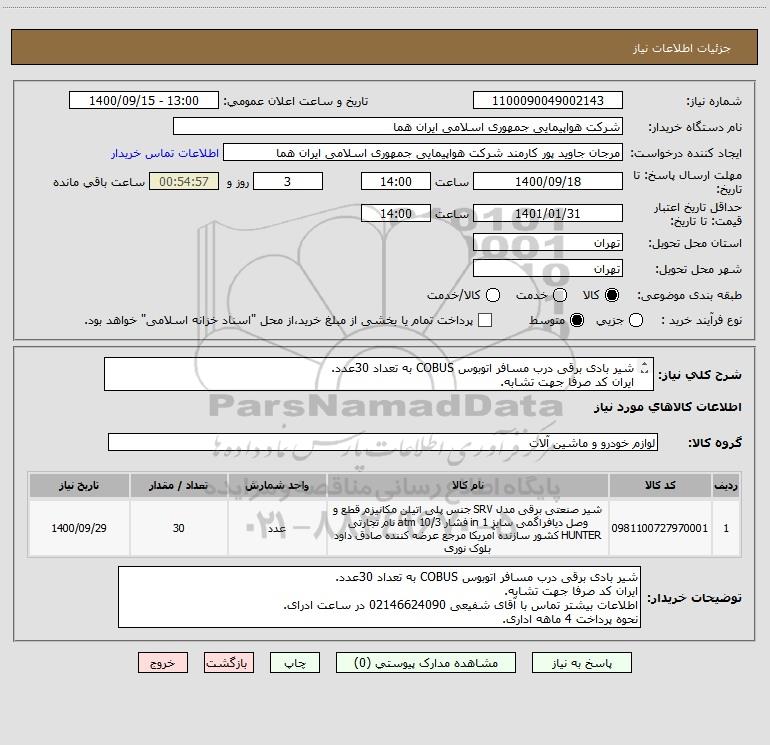 شرح کلی نیاز: شیر بادی برقی درب مسافر اتوبوس COBUS به تعداد 30عدد. ایران کد صرفا جهت تشابه. اطلاعات بیشتر توضیحات مطالعه شود.