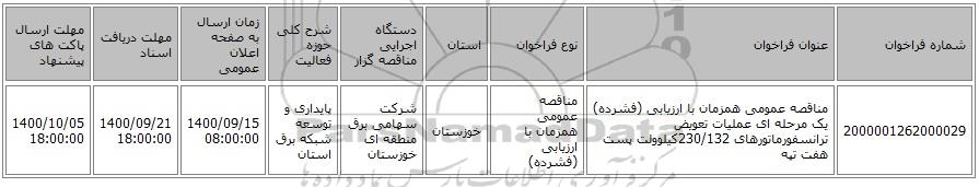 مناقصه، مناقصه عمومی همزمان با ارزیابی (فشرده) یک مرحله ای عملیات تعویض ترانسفورماتورهای 230/132کیلوولت پست هفت تپه, مناقصه عمومی همزمان با ارزیابی (فشرده) یک مرحله ای عملیات تعویض ترانسفورماتورهای 230/132کیلوولت پست هفت تپه