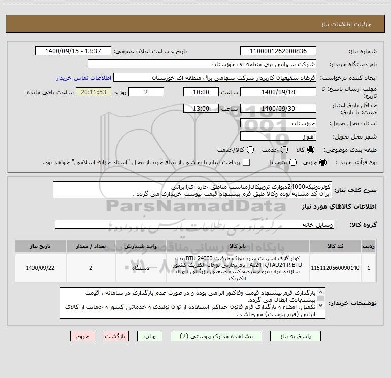 شرح کلی نیاز: کولردوتیکه24000دیواری تروپیکال(مناسب مناطق حاره ای)ایرانی