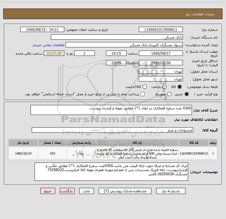 شرح کلی نیاز: 4300 عدد سفره قلمکاری در ابعاد 1*1 مطابق نمونه و قرارداد پیوست.