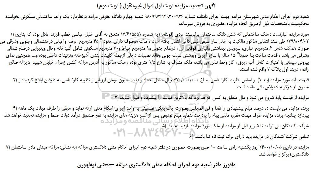 شعبه دوم اجرای احکام مدنی شهرستان مراغه جهت اجرای دادنامه شماره 9809974149300926 شعبه چهارم دادگاه حقوقی مراغه درنظردارد یک واحد ساختمانی مسکونی بخواسته محکومیت بامشخصات ذیل ازطریق انجام مزایده حضوری به فروش میرساند: