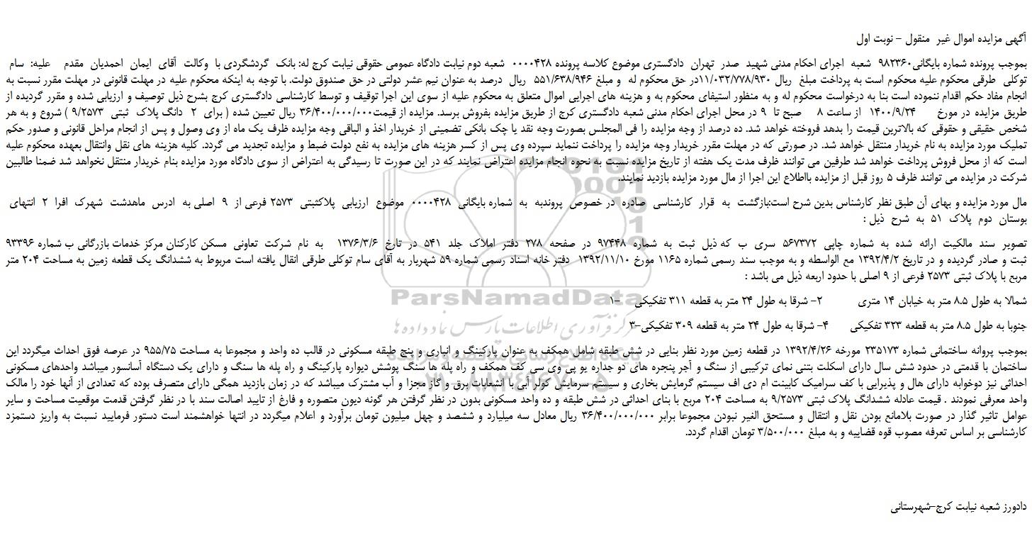بموجب پرونده شماره بایگانی982360 شعبه اجرای احکام مدنی شهید صدر تهران دادگستری موضوع کلاسه پرونده 0000428 شعبه دوم نیابت دادگاه عمومی حقوقی نیابت کرج له: بانک گردشگردی با وکالت آقای ایمان احمدیان مقدم علیه: سام توکلی طرقی محکوم علیه محکوم است به پرداخت مبلغ ریال 11/032/778/930در حق محکوم له و مبلغ 551/638/946 ریال درصد به عنوان نیم عشر دولتی در حق صندوق دولت. با توجه به اینکه محکوم علیه در مهلت قانونی در مهلت مقرر نسبت به انجام مفاد حکم اقدام ننموده است بنا به درخواست محکوم له و به منظور استیفای محکوم به و هزینه های اجرایی اموال متعلق به محکوم علیه از سوی این اجرا توقیف و توسط کارشناسی دادگستری کرج بشرح ذیل توصیف و ارزیابی شده و مقرر گردیده از طریق مزایده در مورخ 1400/9/24 از ساعت 8 صبح تا 9 در محل اجرای احکام مدنی شعبه دادگستری کرج از طریق مزایده بفروش برسد. مزایده از قیمت36/400/000/000 ریال تعیین شده ( برای 2 دانگ پلاک ثبتی 9/2573 ) شروع و به هر شخص حقیقی و حقوقی که بالاترین قیمت را بدهد فروخته خواهد شد. ده درصد از وجه مزایده را فی المجلس بصورت وجه نقد یا چک بانکی تضمینی از خریدار اخذ و الباقی وجه مزایده ظرف یک ماه از وی وصول و پس از انجام مراحل قانونی و صدور حکم تملیک مورد مزایده به نام خریدار منتقل خواهد شد. در صورتی که در مهلت مقرر خریدار وجه مزایده را پرداخت ننماید سپرده وی پس از کسر هزینه های مزایده به نفع دولت ضبط و مزایده تجدید می گردد. کلیه هزینه های نقل وانتقال بعهده محکوم علیه است که از محل فروش پرداخت خواهد شد طرفین می توانند ظرف مدت یک هفته از تاریخ مزایده نسبت به نحوه انجام مزایده اعتراض نمایند که در این صورت تا رسیدگی به اعتراض از سوی دادگاه مورد مزایده بنام خریدار منتقل نخواهد شد ضمنا طالبین شرکت در مزایده می توانند ظرف 5 روز قبل از مزایده بااطلاع این اجرا از مال مورد مزایده بازدید نمایند.