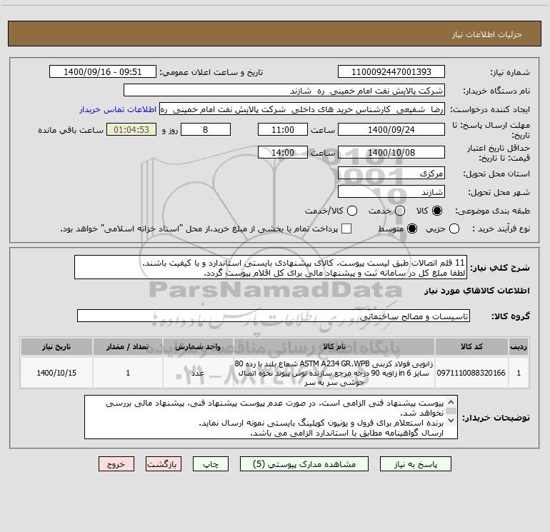شرح کلی نیاز: 11 قلم اتصالات طبق لیست پیوست. کالای پیشنهادی بایستی استاندارد و با کیفیت باشند. لطفا مبلغ کل در سامانه ثبت و پیشنهاد مالی برای کل اقلام پیوست گردد.