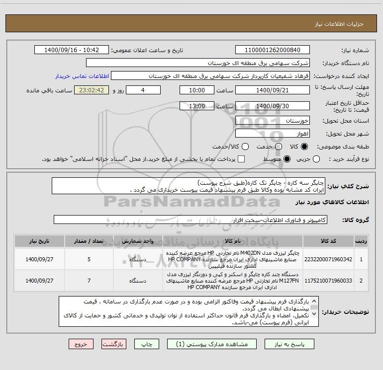 شرح کلی نیاز: چاپگر سه کاره - چاپگر تک کاره(طبق شرح پیوست) ایران کد مشابه بوده وکالا طبق فرم پیشنهاد قیمت پیوست خریداری می گردد .