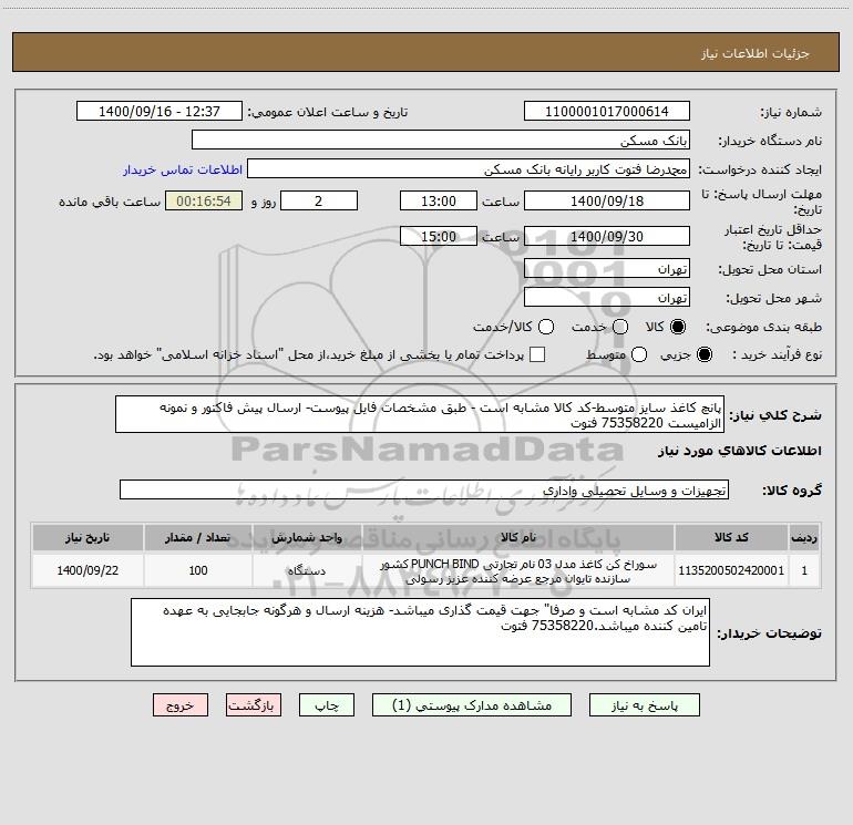 شرح کلی نیاز: پانچ کاغذ سایز متوسط-کد کالا مشابه است - طبق مشخصات فایل پیوست- ارسال پیش فاکتور و نمونه الزامیست 75358220 فتوت