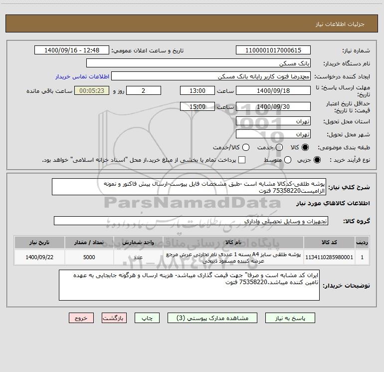 شرح کلی نیاز: پوشه طلقی-کدکالا مشابه است -طبق مشخصات فایل پیوست-ارسال پیش فاکتور و نمونه الزامیست75358220 فتوت