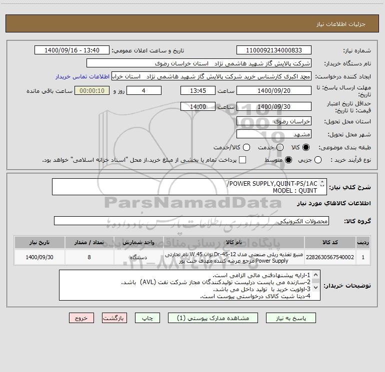 نام دستگاه خریدار:شرکت پالایش گاز شهید هاشمی نژاد استان خراسان رضوی