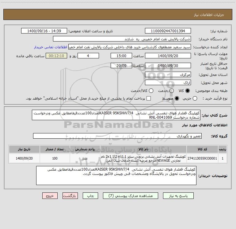 شرح کلی نیاز: کوپلینگ قفلدار هوای تنفسی آتش نشانی KAISER 95KSNW7/4تعداد100عدددقیقامطابق عکس ودرخواست شماره درخواست RNL-0041069