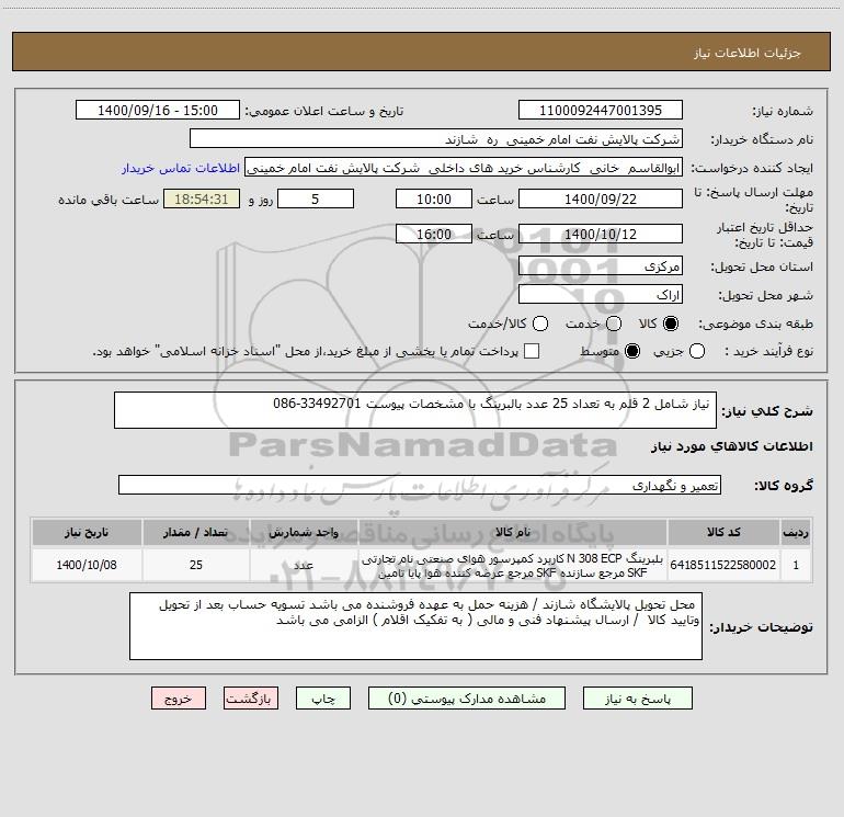 شرح کلی نیاز: نیاز شامل 2 قلم به تعداد 25 عدد بالبرینگ با مشخصات پیوست 33492701-086