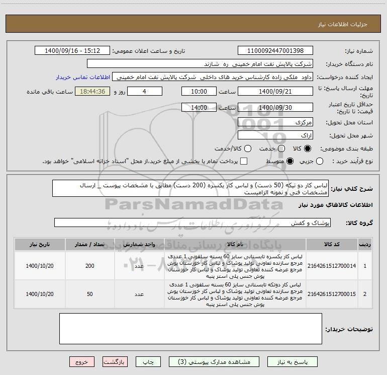 شرح کلی نیاز: لباس کار دو تیکه (50 دست) و لباس کار یکسره (200 دست) مطابق با مشخصات پیوست _ ارسال مشخصات فنی و نمونه الزامیست