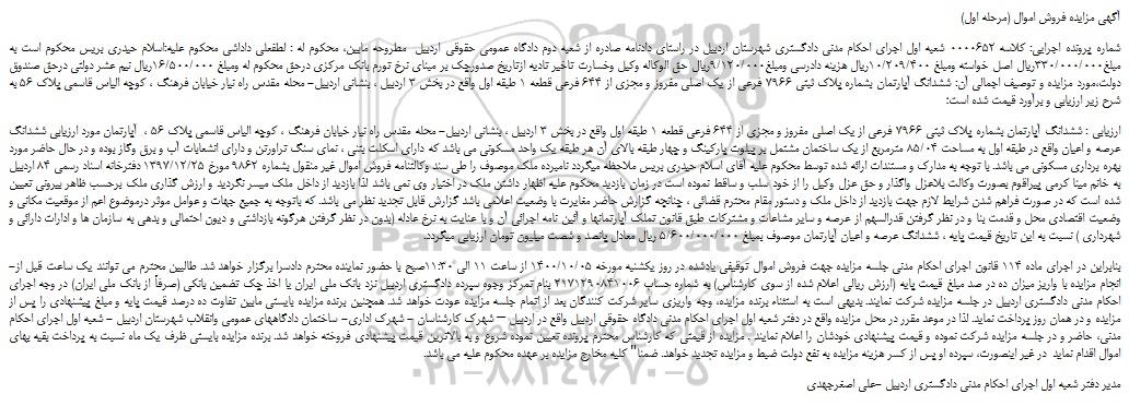 شماره پرونده اجرایی: کلاسه 0000652 شعبه اول اجرای احکام مدنی دادگستری شهرستان اردبیل در راستای دادنامه صادره از شعبه دوم دادگاه عمومی حقوقی اردبیل مطروحه مابین، محکوم له : لطفعلی داداشی محکوم علیه:اسلام حیدری بریس محکوم است به مبلغ330/000/000ریال اصل خواسته ومبلغ 10/209/400ریال هزینه دادرسی ومبلغ9/120/000ریال حق الوکاله وکیل وخسارت تاخیر تادیه ازتاریخ صدورچک بر مبنای نرخ تورم بانک مرکزی درحق محکوم له ومبلغ 16/500/000ریال نیم عشر دولتی درحق صندوق دولت،مورد مزایده و توصیف اجمالی آن: ششدانگ آپارتمان بشماره پلاک ثبتی 7966 فرعی از یک اصلی مفروز و مجزی از 644 فرعی قطعه 1 طبقه اول واقع در بخش 3 اردبیل ، بنشانی اردبیل- محله مقدس راه نیار خیابان فرهنگ ، کوچه الیاس قاسمی پلاک 56 به شرح زیر ارزیابی و برآورد قیمت شده است؛