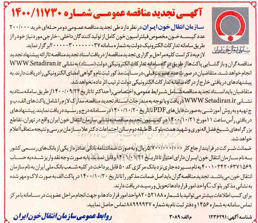 سازمان انتقال خون ایران در نظر دارد طی تجدید مناقصه عمومی دو مرحله ای 200.000 عدد کیسه خون مخصوص فیلتراسیون خون کامل از تولید داخلی - خارجی از طریق سامانه تدارکات الکترونیکی دولت به شماره سامانه 2000003000000037 خریداری کند.