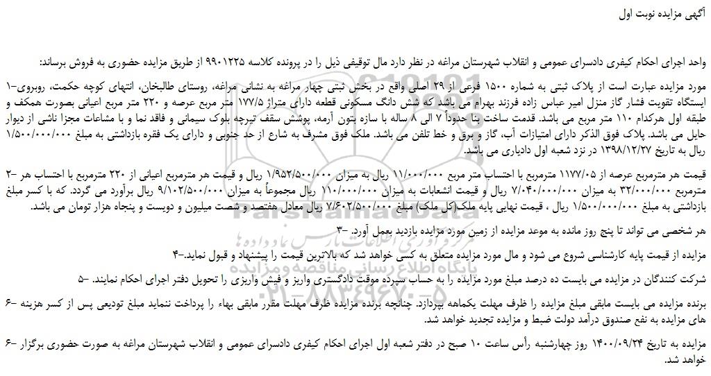 واحد اجرای احکام کیفری دادسرای عمومی و انقلاب شهرستان مراغه در نظر دارد مال توقیفی ذیل را در پرونده کلاسه 9901225 از طریق مزایده حضوری به فروش برساند: