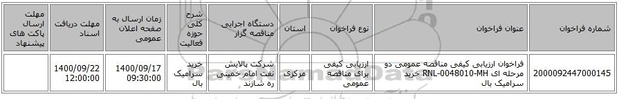مناقصه، فراخوان ارزیابی کیفی مناقصه عمومی دو مرحله ای RNL-0048010-MH خرید سرامیک بال از کلیه افراد متخصص و شرکتها واجد شرایط دعوت به عمل میآید در مناقصه با کد خبرگزاری پارس نماد: 4035865 شرکت نمایند.
