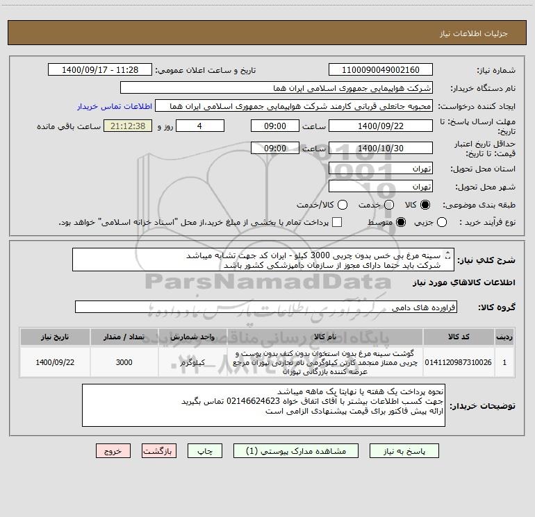 شرح کلی نیاز: سینه مرغ بی خس بدون چربی 3000 کیلو - ایران کد جهت تشابه میباشد شرکت باید حتما دارای مجوز از سازمان دامپزشکی کشور باشد