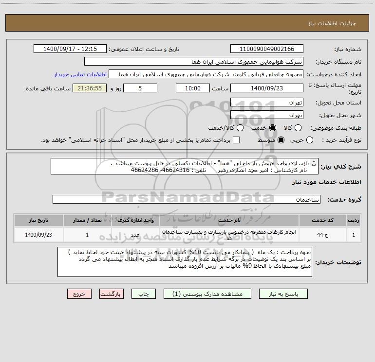 شرح کلی نیاز: بازسازی واحد فروش بار داخلی "هما" - اطلاعات تکمیلی در فایل پیوست میباشد . نام کارشناس : امیر محمد انصاری رهبر تلفن : 46624316- 46624286