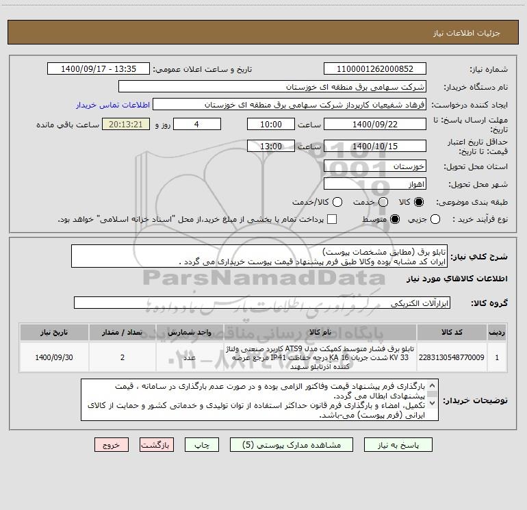 شرح کلی نیاز: تابلو برق (مطابق مشخصات پیوست) ایران کد مشابه بوده وکالا طبق فرم پیشنهاد قیمت پیوست خریداری می گردد .