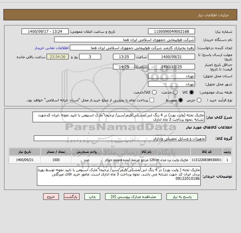 استعلام ماژیک تخته (وایت بورد) در 4 رنگ ابی/مشکی/قرمز/سبز/ ترجیحا"مارک اسنومن با تایید نمونه .ایران کدجهت تشابه .نحوه پرداخت 3 ماه اداری , استعلام ماژیک تخته (وایت بورد) در 4 رنگ ابی/مشکی/قرمز/سبز/ ترجیحا"مارک اسنومن با تایید نمونه .ایران کدجهت تشابه .نحوه پرداخت 3 ماه اداری