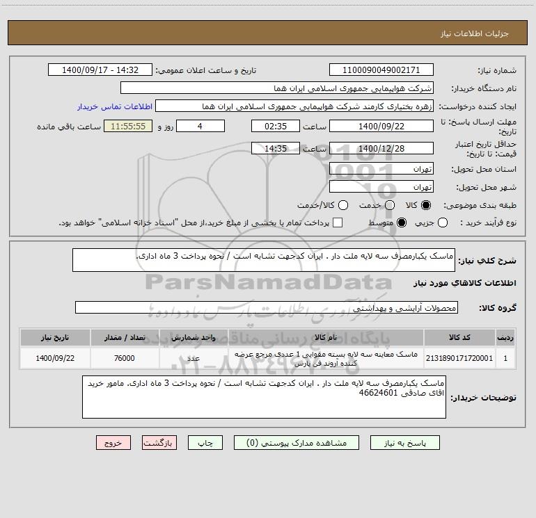 شرح کلی نیاز: ماسک یکبارمصرف سه لایه ملت دار . ایران کدجهت تشابه است / نحوه پرداخت 3 ماه اداری.