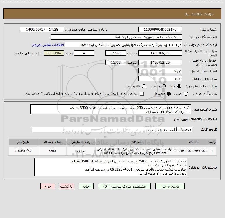 توضیحات خریدار:مایع ضد غفونی کننده دست 250 سی سی اسپری پاش به تعداد 3500 بطری. ایران کد صرفا جهت تشابه. اطلاعات بیشتر تماس باآقای صادقی 09122374601 در ساعت اداری. نحوه پرداخت مالی 3 ماهه اداری.