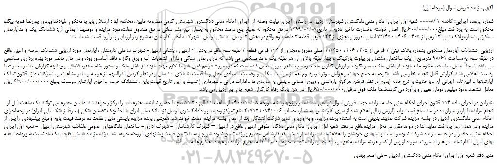 شماره پرونده اجرایی: کلاسه 0000841 شعبه اول اجرای احکام مدنی دادگستری شهرستان اردبیل در راستای اجرای نیابت واصله از اجرای احکام مدنی دادگستری شهرستان گرمی مطروحه مابین، محکوم لها : ارسلان پابرجا محکوم علیه:خداویردی پوررضا قوجه بیگلو محکوم است به پرداخت مبلغ600/000/000ریال اصل خواسته وخسارت تاخیر تادیه از تاریخ1399/01/09 درحق محکوم له ومبلغ پنج درصد محکوم به بعنوان نیم عشر دولتی درحق صندوق دولت،مورد مزایده و توصیف اجمالی آن: ششدانگ یک واحدآپارتمان مسکونی بشماره پلاک ثبتی 3 فرعی از 405 ، 406 ، 73/450 اصلی مفروز و مجزی از 124 فرعی قطعه 3 طبقه سوم واقع در بخش 3 اردبیل ، بنشانی اردبیل- شهرک ساحلی کارمندان به شرح زیر ارزیابی و برآورد قیمت شده است؛