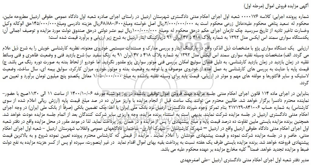 شماره پرونده اجرایی: کلاسه 0000176 شعبه اول اجرای احکام مدنی دادگستری شهرستان اردبیل در راستای اجرای صادره شعبه اول دادگاه عمومی حقوقی اردبیل مطروحه مابین، محکوم له :سعید پناهی محکوم علیه:عادل زرعی محکوم است به 2/000/000/000ریال اصل خواسته ومبلغ68/880/600ریال هزینه دادرسی ومبلغ145/000/000حق الوکاله وکیل وخسارت تاخیر تادیه از تاریخ سررسید چک تازمان اجرای حکم درحق محکوم له ،ومبلغ 100/000/000ریال نیم عشر دولتی درحق صندوق دولت مورد مزایده و توصیف اجمالی آن: یکدستگاه سواری سمند اس ایکس مدل 1392 به شماره پلاک 418 د 47 ایران 91 درپارکینگ ایثار اردبیل به شرح زیر ارزیابی و برآورد قیمت شده است؛