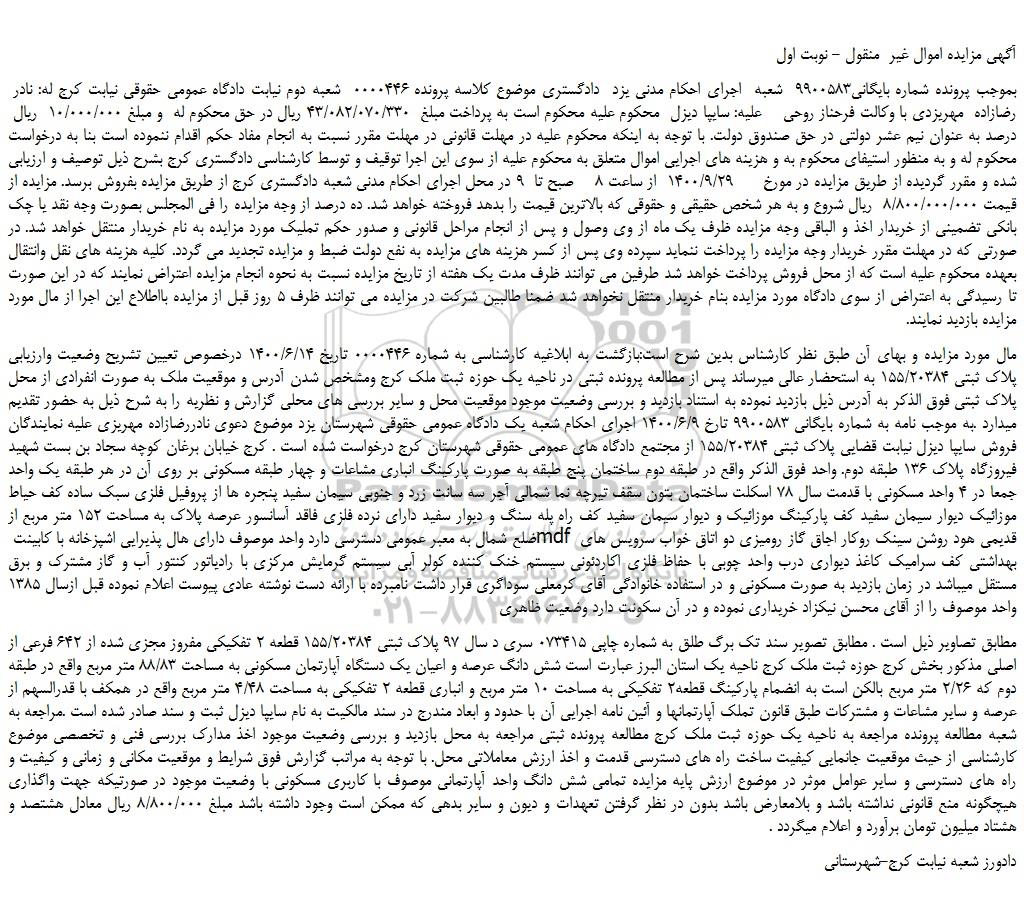 بموجب پرونده شماره بایگانی9900583 شعبه اجرای احکام مدنی یزد دادگستری موضوع کلاسه پرونده 0000446 شعبه دوم نیابت دادگاه عمومی حقوقی نیابت کرج له: نادر رضازاده مهریزدی با وکالت فرحناز روحی علیه: سایپا دیزل محکوم علیه محکوم است به پرداخت مبلغ 43/082/070/330 ریال در حق محکوم له و مبلغ 10/000/000 ریال درصد به عنوان نیم عشر دولتی در حق صندوق دولت. با توجه به اینکه محکوم علیه در مهلت قانونی در مهلت مقرر نسبت به انجام مفاد حکم اقدام ننموده است بنا به درخواست محکوم له و به منظور استیفای محکوم به و هزینه های اجرایی اموال متعلق به محکوم علیه از سوی این اجرا توقیف و توسط کارشناسی دادگستری کرج بشرح ذیل توصیف و ارزیابی شده و مقرر گردیده از طریق مزایده در مورخ 1400/9/29 از ساعت 8 صبح تا 9 در محل اجرای احکام مدنی شعبه دادگستری کرج از طریق مزایده بفروش برسد. مزایده از قیمت 8/800/000/000 ریال شروع و به هر شخص حقیقی و حقوقی که بالاترین قیمت را بدهد فروخته خواهد شد. ده درصد از وجه مزایده را فی المجلس بصورت وجه نقد یا چک بانکی تضمینی از خریدار اخذ و الباقی وجه مزایده ظرف یک ماه از وی وصول و پس از انجام مراحل قانونی و صدور حکم تملیک مورد مزایده به نام خریدار منتقل خواهد شد. در صورتی که در مهلت مقرر خریدار وجه مزایده را پرداخت ننماید سپرده وی پس از کسر هزینه های مزایده به نفع دولت ضبط و مزایده تجدید می گردد. کلیه هزینه های نقل وانتقال بعهده محکوم علیه است که از محل فروش پرداخت خواهد شد طرفین می توانند ظرف مدت یک هفته از تاریخ مزایده نسبت به نحوه انجام مزایده اعتراض نمایند که در این صورت تا رسیدگی به اعتراض از سوی دادگاه مورد مزایده بنام خریدار منتقل نخواهد شد ضمنا طالبین شرکت در مزایده می توانند ظرف 5 روز قبل از مزایده بااطلاع این اجرا از مال مورد مزایده بازدید نمایند.