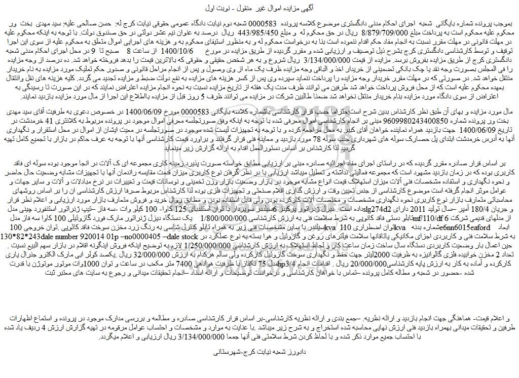بموجب پرونده شماره بایگانی شعبه اجرای احکام مدنی دادگستری موضوع کلاسه پرونده 0000583 شعبه دوم نیابت دادگاه عمومی حقوقی نیابت کرج له: حسن صالحی علیه: سید مهدی بخت ور محکوم علیه محکوم است به پرداخت مبلغ 8/879/709/000 ریال در حق محکوم له و مبلغ 443/985/450 ریال درصد به عنوان نیم عشر دولتی در حق صندوق دولت. با توجه به اینکه محکوم علیه در مهلت قانونی در مهلت مقرر نسبت به انجام مفاد حکم اقدام ننموده است بنا به درخواست محکوم له و به منظور استیفای محکوم به و هزینه های اجرایی اموال متعلق به محکوم علیه از سوی این اجرا توقیف و توسط کارشناسی دادگستری کرج بشرح ذیل توصیف و ارزیابی شده و مقرر گردیده از طریق مزایده در مورخ 1400/10/6 از ساعت 8 صبح تا 9 در محل اجرای احکام مدنی شعبه دادگستری کرج از طریق مزایده بفروش برسد. مزایده از قیمت 3/134/000/000 ریال شروع و به هر شخص حقیقی و حقوقی که بالاترین قیمت را بدهد فروخته خواهد شد. ده درصد از وجه مزایده را فی المجلس بصورت وجه نقد یا چک بانکی تضمینی از خریدار اخذ و الباقی وجه مزایده ظرف یک ماه از وی وصول و پس از انجام مراحل قانونی و صدور حکم تملیک مورد مزایده به نام خریدار منتقل خواهد شد. در صورتی که در مهلت مقرر خریدار وجه مزایده را پرداخت ننماید سپرده وی پس از کسر هزینه های مزایده به نفع دولت ضبط و مزایده تجدید می گردد. کلیه هزینه های نقل وانتقال بعهده محکوم علیه است که از محل فروش پرداخت خواهد شد طرفین می توانند ظرف مدت یک هفته از تاریخ مزایده نسبت به نحوه انجام مزایده اعتراض نمایند که در این صورت تا رسیدگی به اعتراض از سوی دادگاه مورد مزایده بنام خریدار منتقل نخواهد شد ضمنا طالبین شرکت در مزایده می توانند ظرف 5 روز قبل از مزایده بااطلاع این اجرا از مال مورد مزایده بازدید نمایند.