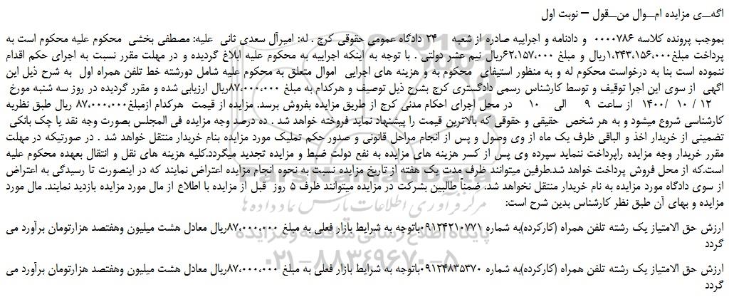 بموجب پرونده کلاسه 0000786 و دادنامه و اجراییه صادره از شعبه 24 دادگاه عمومی حقوقی کرج . له: امیرآل سعدی ثانی علیه: مصطفی بخشی محکوم علیه محکوم است به پرداخت مبلغ1،243،156،000ریال و مبلغ 62،157،000ریال نیم عشر دولتی . با توجه به اینکه اجراییه به محکوم علیه ابلاغ گردیده و در مهلت مقرر نسبت به اجرای حکم اقدام ننموده است بنا به درخواست محکوم له و به منظور استیفای محکوم به و هزینه های اجرایی اموال متعلق به محکوم علیه شامل دورشته خط تلفن همراه اول به شرح ذیل این اگهی از سوی این اجرا توقیف و توسط کارشناس رسمی دادگستری کرج بشرح ذیل توصیف و هرکدام به مبلغ 87،000،000ریال ارزیابی شده و مقرر گردیده در روز سه شنبه مورخ 12 / 10 /1400 از ساعت 9 الی 10 در محل اجرای احکام مدنی کرج از طریق مزایده بفروش برسد. مزایده از قیمت هرکدام ازمبلغ87،000،000 ریال طبق نظریه کارشناسی شروع میشود و به هر شخص حقیقی و حقوقی که بالاترین قیمت را پیشنهاد نماید فروخته خواهد شد . ده درصد وجه مزایده فی المجلس بصورت وجه نقد یا چک بانکی تضمینی از خریدار اخذ و الباقی ظرف یک ماه از وی وصول و پس از انجام مراحل قانونی و صدور حکم تملیک مورد مزایده بنام خریدار منتقل خواهد شد . در صورتیکه در مهلت مقرر خریدار وجه مزایده راپرداخت ننماید سپرده وی پس از کسر هزینه های مزایده به نفع دولت ضبط و مزایده تجدید میگردد.کلیه هزینه های نقل و انتقال بعهده محکوم علیه است.که از محل فروش پرداخت خواهد شد.طرفین میتوانند ظرف مدت یک هفته از تاریخ مزایده نسبت به نحوه انجام مزایده اعتراض نمایند که در اینصورت تا رسیدگی به اعتراض از سوی دادگاه مورد مزایده به نام خریدار منتقل نخواهد شد. ضمناً طالبین بشرکت در مزایده میتوانند ظرف 5 روز قبل از مزایده با اطلاع از مال مورد مزایده بازدید نمایند. مال مورد مزایده و بهای آن طبق نظر کارشناس بدین شرح است: