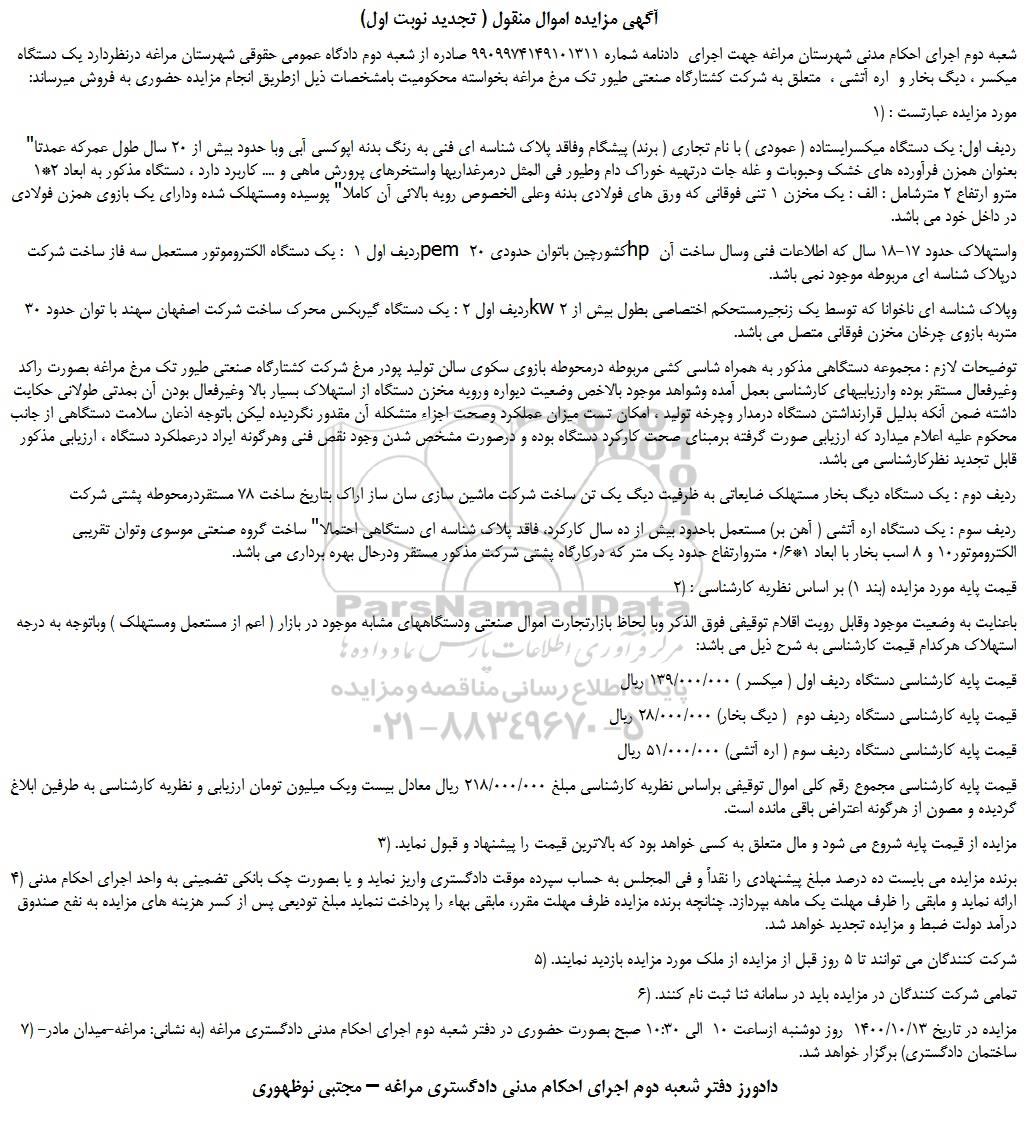 شعبه دوم اجرای احکام مدنی شهرستان مراغه جهت اجرای  دادنامه شماره 9909974149101311 صادره از شعبه دوم دادگاه عمومی حقوقی شهرستان مراغه درنظردارد یک دستگاه میکسر ، دیگ بخار و  اره آتشی ،  متعلق به شرکت کشتارگاه صنعتی طیور تک مرغ مراغه بخواسته محکومیت بامشخصات ذیل ازطریق انجام مزایده حضوری به فروش میرساند: