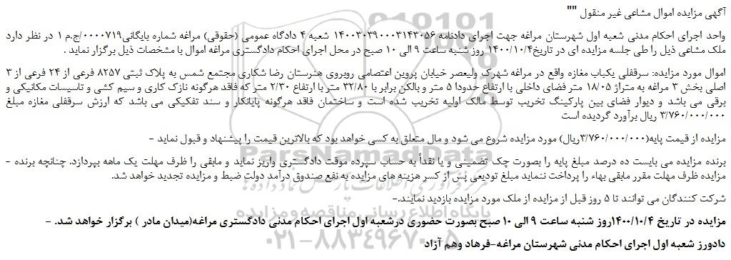 - مزایده در تاریخ 1400/10/4روز شنبه ساعت 9 الی 10 صبح بصورت حضوری درشعبه اول اجرای احکام مدنی دادگستری مراغه(میدان مادر ) برگزار خواهد شد.