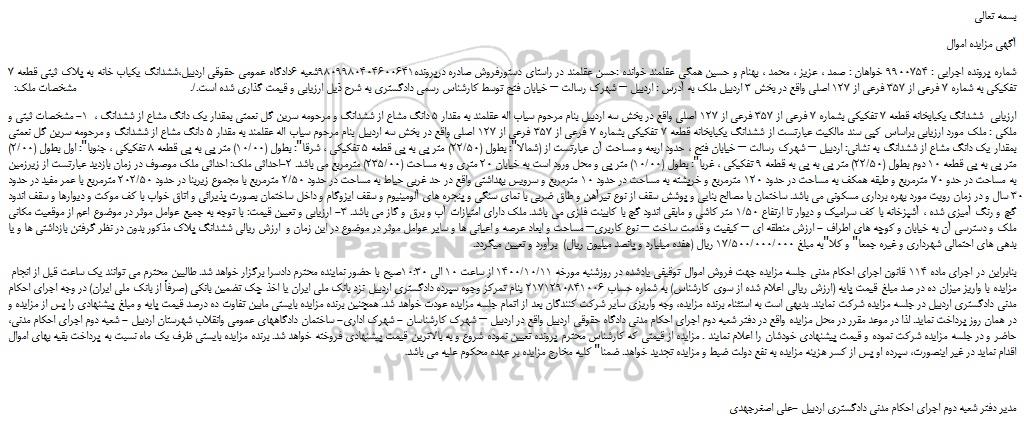 شماره پرونده اجرایی : 9900754 خواهان : صمد ، عزیز ، محمد ، بهنام و حسین همگی عقلمند خوانده :حسن عقلمند در راستای دستورفروش صادره درپرونده9809980404600641شعبه 6دادگاه عمومی حقوقی اردبیل،ششدانگ یکباب خانه به پلاک ثبتی قطعه 7 تفکیکی به شماره 7 فرعی از 357 فرعی از 127 اصلی واقع در بخش 3 اردبیل ملک به آدرس : اردبیل – شهرک رسالت – خیابان فتح توسط کارشناس رسمی دادگستری به شرح ذیل ارزیابی و قیمت گذاری شده است./. مشخصات ملک:
