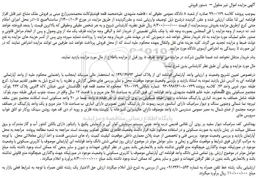 بموجب پرونده کلاسه 9900179 صادره از شعبه 8 دادگاه عمومی حقوقی له : فاطمه مشهدی علیه:محمد قلعه قوندباوکالت محمدمدیرزارع مبنی بر فروش ملک مشاع غیر قابل افراز قولنامه ایی لذا ملک ارزیابی شده و مقرر گردیده درشرح ذیل توصیف وارزیابی شده و مقررگردیده از طریق مزایده در مورخ 1400/10/6از ساعت9صبح تا10در محل اجرای احکام مدنی کرج ازطریق مزایده بفروش برسد.مزایده از قیمت 8/300/000/000 ریال طبق نظریه کارشناس شروع و به هر شخص حقیقی وحقوقی که بالاترین قیمت را بدهد فروخته خواهد شد. ده درصد از وجه مزایده را فی المجلس بصورت وجه نقد یا چک بانکی تضمینی از خریدار اخذ و الباقی وجه مزایده ظرف یک ماه از وی وصول و پس از انجام مراحل قانونی و صدور حکم تملیک مورد مزایده به نام خریدار منتقل خواهد شد. درصورتی که در مهلت مقرر خریدار وجه مزایده را پرداخت ننماید سپرده وی پس از کسر هزینه های مزایده به نفع دولت ضبط و مزایده تجدید می گردد. کلیه هزینه های نقل وانتقال بعهده محکوم علیه است که از محل فروش پرداخت خواهد شد طرفین می توانند مزایده اعتراض نمایند که در این صورت تا رسیدگی به اعتراض ازسوی دادگاه مورد مزایده