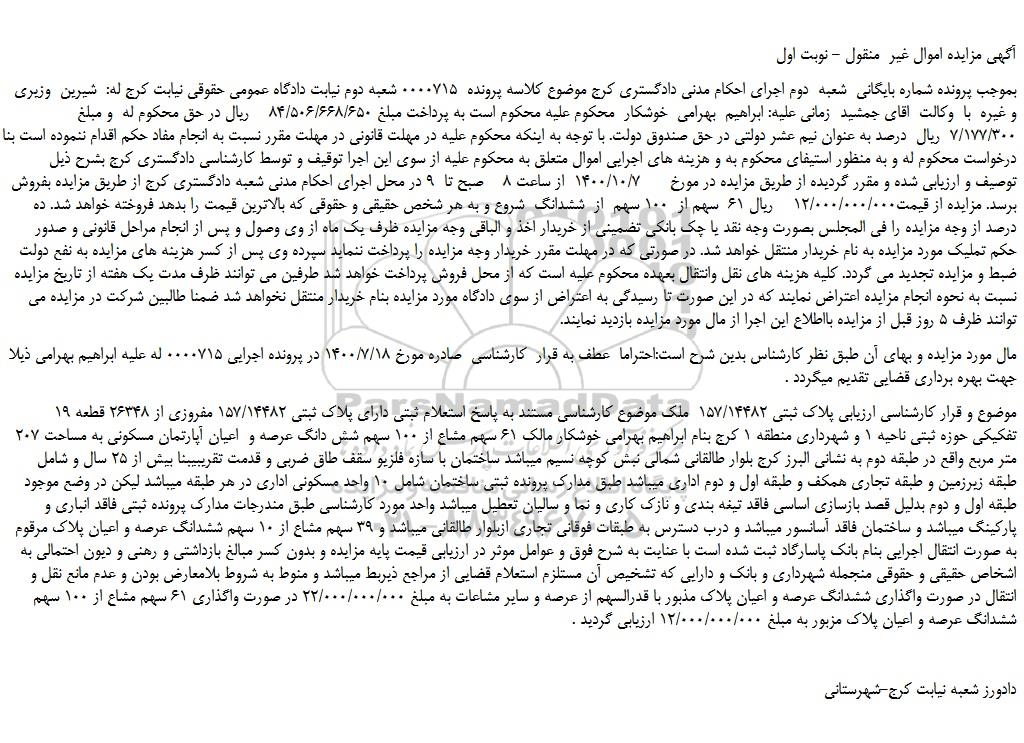 بموجب پرونده شماره بایگانی شعبه دوم اجرای احکام مدنی دادگستری کرج موضوع کلاسه پرونده 0000715 شعبه دوم نیابت دادگاه عمومی حقوقی نیابت کرج له: شیرین وزیری و غیره با وکالت اقای جمشید زمانی علیه: ابراهیم بهرامی خوشکار محکوم علیه محکوم است به پرداخت مبلغ 84/506/668/650 ریال در حق محکوم له و مبلغ 7/177/300 ریال درصد به عنوان نیم عشر دولتی در حق صندوق دولت. با توجه به اینکه محکوم علیه در مهلت قانونی در مهلت مقرر نسبت به انجام مفاد حکم اقدام ننموده است بنا به درخواست محکوم له و به منظور استیفای محکوم به و هزینه های اجرایی اموال متعلق به محکوم علیه از سوی این اجرا توقیف و توسط کارشناسی دادگستری کرج بشرح ذیل توصیف و ارزیابی شده و مقرر گردیده از طریق مزایده در مورخ 1400/10/7 از ساعت 8 صبح تا 9 در محل اجرای احکام مدنی شعبه دادگستری کرج از طریق مزایده بفروش برسد. مزایده از قیمت12/000/000/000 ریال 61 سهم از 100 سهم از ششدانگ شروع و به هر شخص حقیقی و حقوقی که بالاترین قیمت را بدهد فروخته خواهد شد. ده درصد از وجه مزایده را فی المجلس بصورت وجه نقد یا چک بانکی تضمینی از خریدار اخذ و الباقی وجه مزایده ظرف یک ماه از وی وصول و پس از انجام مراحل قانونی و صدور حکم تملیک مورد مزایده به نام خریدار منتقل خواهد شد. در صورتی که در مهلت مقرر خریدار وجه مزایده را پرداخت ننماید سپرده وی پس از کسر هزینه های مزایده به نفع دولت ضبط و مزایده تجدید می گردد. کلیه هزینه های نقل وانتقال بعهده محکوم علیه است که از محل فروش پرداخت خواهد شد طرفین می توانند ظرف مدت یک هفته از تاریخ مزایده نسبت به نحوه انجام مزایده اعتراض نمایند که در این صورت تا رسیدگی به اعتراض از سوی دادگاه مورد مزایده بنام خریدار منتقل نخواهد شد ضمنا طالبین شرکت در مزایده می توانند ظرف 5 روز قبل از مزایده بااطلاع این اجرا از مال مورد مزایده بازدید نمایند.