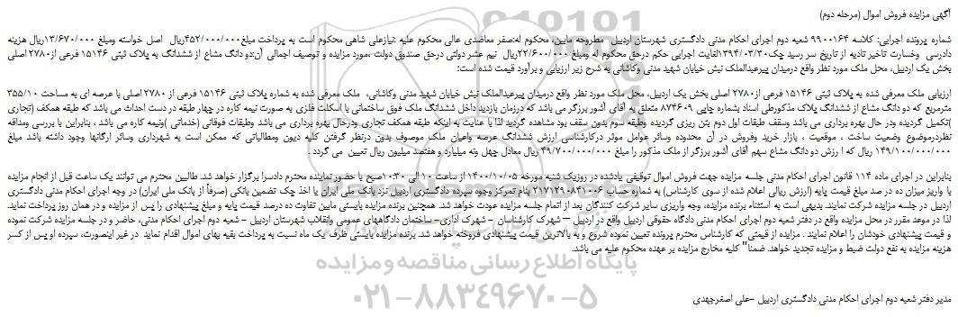 شماره پرونده اجرایی: کلاسه 9900164 شعبه دوم اجرای احکام مدنی دادگستری شهرستان اردبیل مطروحه مابین، محکوم له:صفر معاضدی عالی محکوم علیه :نیازعلی شاهی محکوم است به پرداخت مبلغ452/000/000ریال اصل خواسته ومبلغ 13/670/000ریال هزینه دادرسی وخسارت تاخیر تادیه از تاریخ سر رسید چک1394/03/30لغایت اجرایی حکم درحق محکوم له ومبلغ 22/600/000ریال نیم عشر دولتی درحق صندوق دولت ،مورد مزایده و توصیف اجمالی آن:دو دانگ مشاع از ششدانگ به پلاک ثبتی 15146 فرعی از2780 اصلی بخش یک اردبیل، محل ملک مورد نظر واقع درمیدان پیرعبدالملک نبش خیابان شهید مدنی وکاشانی به شرح زیر ارزیابی و برآورد قیمت شده است؛