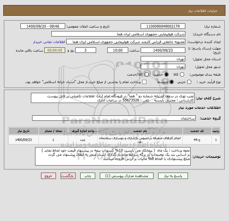 شرح کلی نیاز: نصب توری در سقف آشیانه شماره دو " هما" در فرودگاه امام (ره)- اطلاعات تکمیلی در فایل پیوست