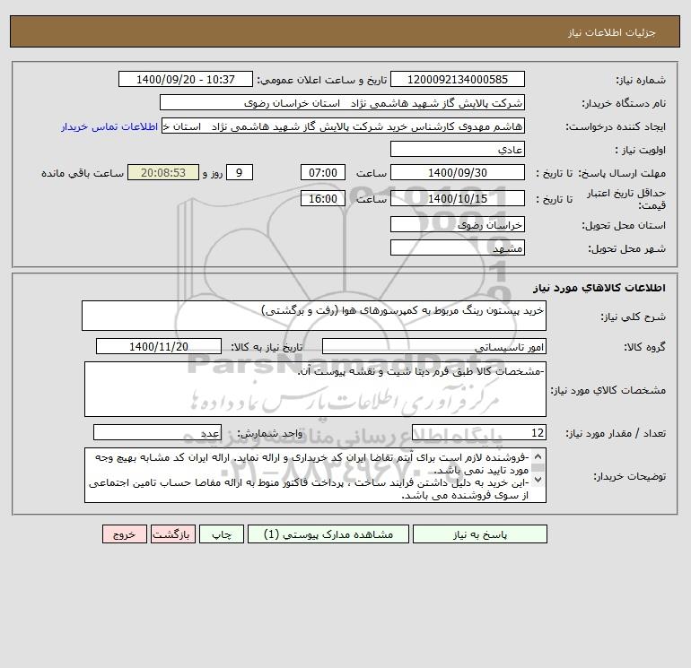 نام دستگاه خریدار:شرکت پالایش گاز شهید هاشمی نژاد استان خراسان رضوی