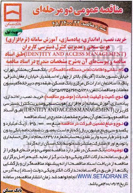 خرید، نصب، راه اندازی، پیاده سازی ، آموزش سامانه (نرم افزاری) هویت سنجی و مدیریت کنترل دسترسی کاربران (IDENTITY AND ACCESS MANAGEMENT ) طبق اسناد مناقصه و پیوست های آن به شرح مشخصات مندرج در اسناد مناقصه